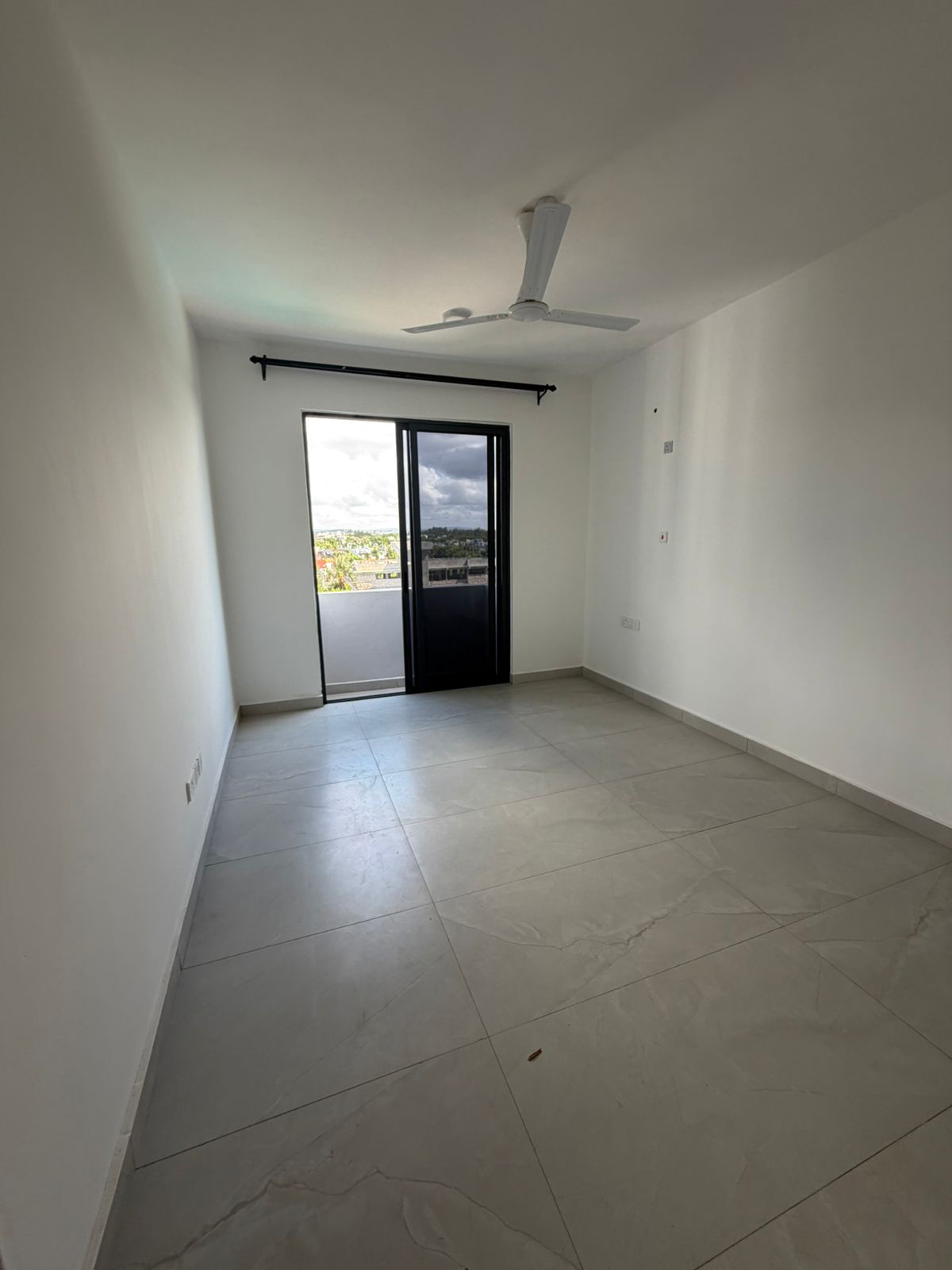 The spacious living room opens onto a balcony, creating a seamless indoor-outdoor living experience perfect for relaxation or entertaining guests.